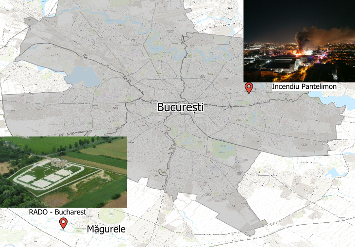 Figure 1. Map of Bucharest showing the location of the Pantelimon fire (top right) and the position of the RADO-Bucharest observatory (bottom left). Fire image source: ProTV, https://stirileprotv.ro.